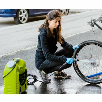 Ce nettoyeur multifonctions portatif s’emporte et s’utilise partout, même hors réseau car il ne nécessite pas d’être raccordé à l’eau ni à l’électricité. Il est équipé d’une batterie rechargeable sur une prise de courant standard (220V). Un câble 12V permet de le recharger via l’allume-cigare d’une voiture. Également mobile en milieu urbain, il est dorénavant possible d’entretenir son vélo en bas de chez soi. Avec un réservoir d’eau d’une capacité de 17 litres, cette station de lavage offre une autonomie suffisante pour plusieurs lavages complets. Idéal si on utilise plusieurs vélos dans la famille. Le pistolet permet d’ajuster la pression du jet entre 3 à 9 bars et de choisir entre 2 modes de jet : jet puissant ou vaporisation. Avec une batterie lithium-ion 2200 mAH rechargeable, son temps de charge est de 2 heures. Le temps d’utilisation est de 30 minutes.