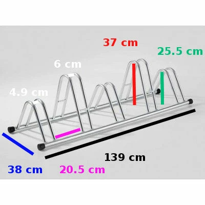 Long de 139 cm, large de 38 cm et haut de 38.5 cm, ce range vélos pèse 7.3 kilos. Il se pose simplement au sol. Il est muni de capuchons qui permettent de le stabiliser afin de ne pas rayer le sol.